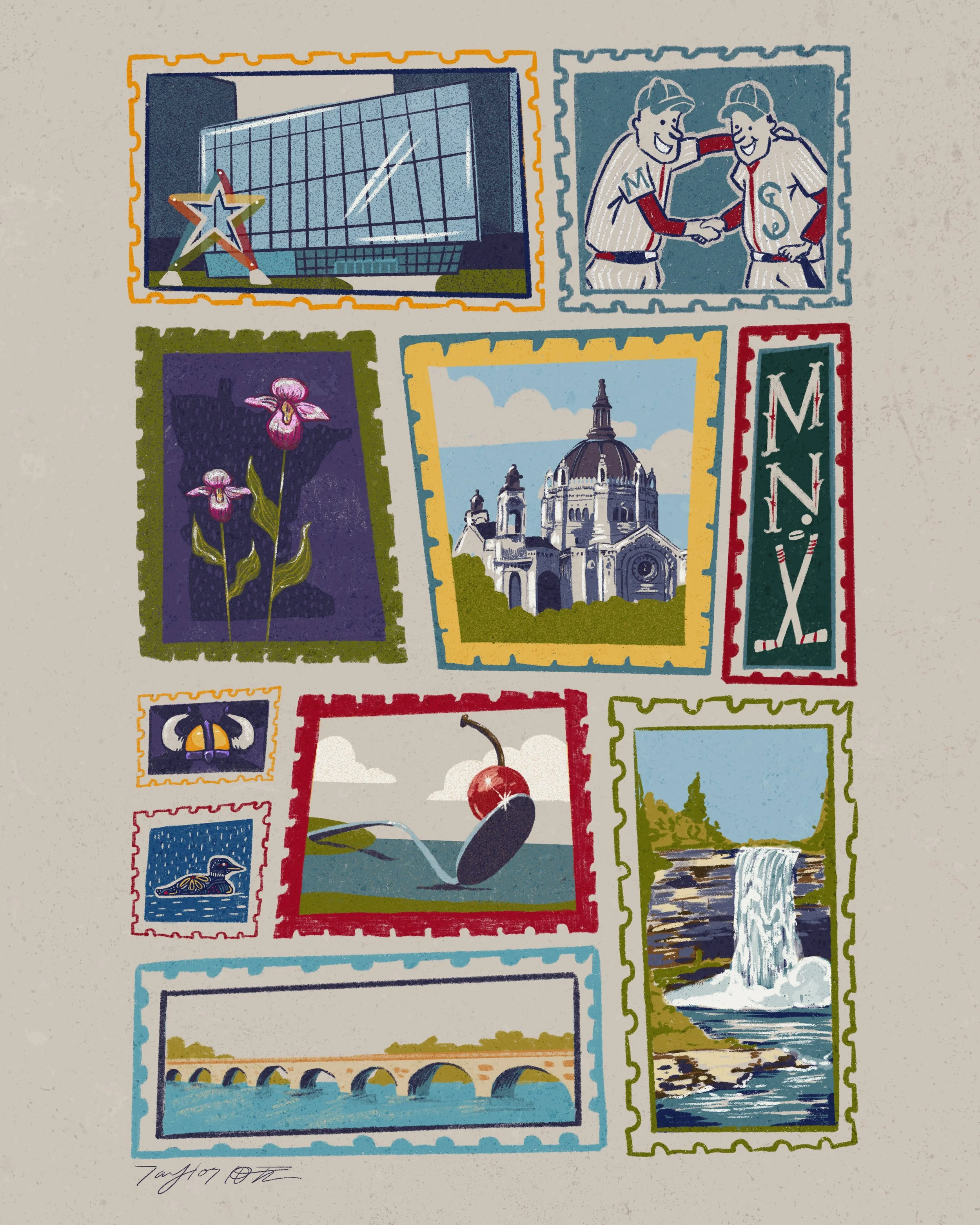 These art prints celebrate various Midwest cities, including Chicago, Minneapolis, and Kansas City. I illustrated them using Procreate and Photoshop to achieve a hand-drawn style while adding depth and texture.