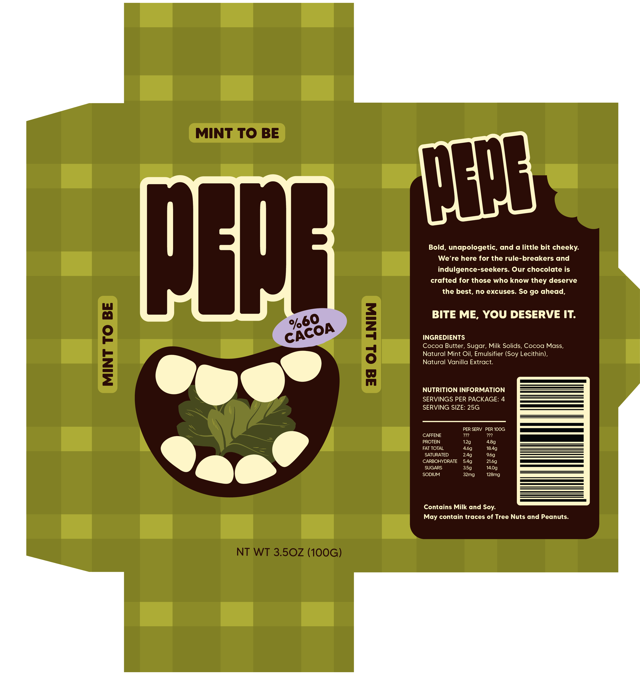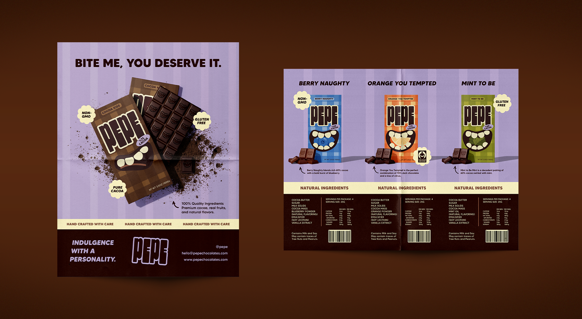Pepe Chocolate represents my passion for bold, personality-driven design. Through striking visuals, clever copy, and cohesive branding across print, digital, and experiential touchpoints, this project highlights my creative range and strategic thinking.